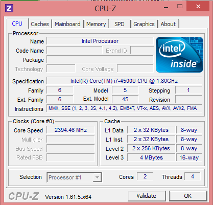 La CPU ultra-low-voltage Core i7-4500U ha un thermal design power particolarmente basso da 15 watts. Chipset, controller di memoria e scheda grafica interna sono sono tutti integrati. La velocità base di 1,800 MHz può essere aumentata fino a 3,000 MHz (single-thread) tramite Turbo Boost, in base allo stato di carica. Questa tecnologia è particolarmente evidente con i programmi che utilizzano un solo processor core. Grazie all'hyper-threading 4 threads possono essere elaborati in simultanea, come pure è possibile per i software distribuire il carico di lavoro su varie unità di processo per migliorare le prestazioni.