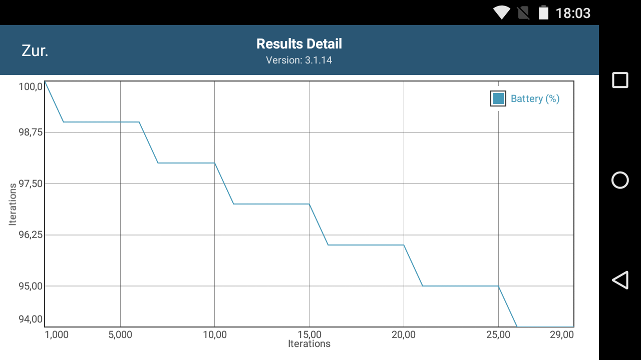 Abbiamo verificato cosa succede sotto il cofano con il Battery Test di GFXBench 3.1. Il test OpenGL ES 2.0 "T-Rex" ha girato trenta volte in successione registrando tutti i tipi di dati tecnici in aggiunta allo stato della batteria. Ad esempio, i frame rates che sono stati molto stabili con il Moto G. Non si verifica throttling anche sotto carico permanente.