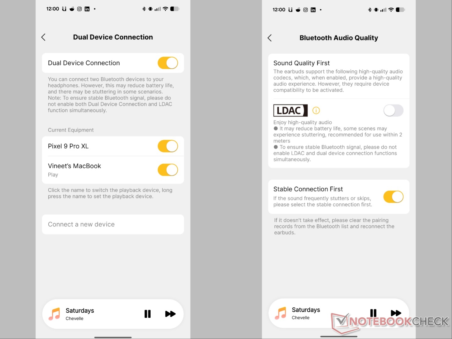 LDAC funziona come previsto e abbiamo notato un'uscita audio leggermente migliorata quando è stato abbinato al Pixel 9 Pro XL e LDAC è stato attivato nelle opzioni sviluppatore. Con LDAC attivato, non è possibile utilizzare la connessione a doppio dispositivo. A questo proposito, l'accoppiamento con due dispositivi - il Pixel e un MacBook Air M4 - ha funzionato come indicato, con gli auricolari che passavano automaticamente alla sorgente con audio attivo. Tuttavia, abbiamo notato che dopo aver tolto gli auricolari dalla custodia e averli collegati automaticamente a entrambi i dispositivi, la riproduzione di musica sul telefono non inviava l'audio agli auricolari. Scollegandoli dal MacBook Air, hanno ricominciato a inviare l'audio dal telefono, il che indica che stavano falsamente rilevando l'ingresso audio dal MacBook Air, anche se non era in corso alcuna riproduzione. Una volta scollegati e ricollegati al MacBook Air, hanno funzionato come dovrebbero. Ma il problema si ripresenta spesso.