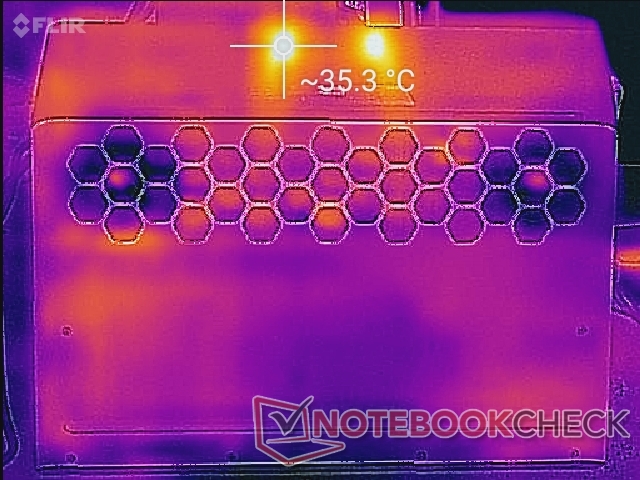 Le zone più calde del sistema sono sulla parte posteriore sporgente, come mostrato dalle nostre mappe di temperatura qui sotto. Le superfici qui possono raggiungere ben oltre i 50 °C, ma questo è fortunatamente lontano da dove toccano gli utenti. L'Eurocom Sky X7C ha battuto ancora una volta l'Alienware con temperature di superficie più fresche quando è sottoposto a carichi pesanti.