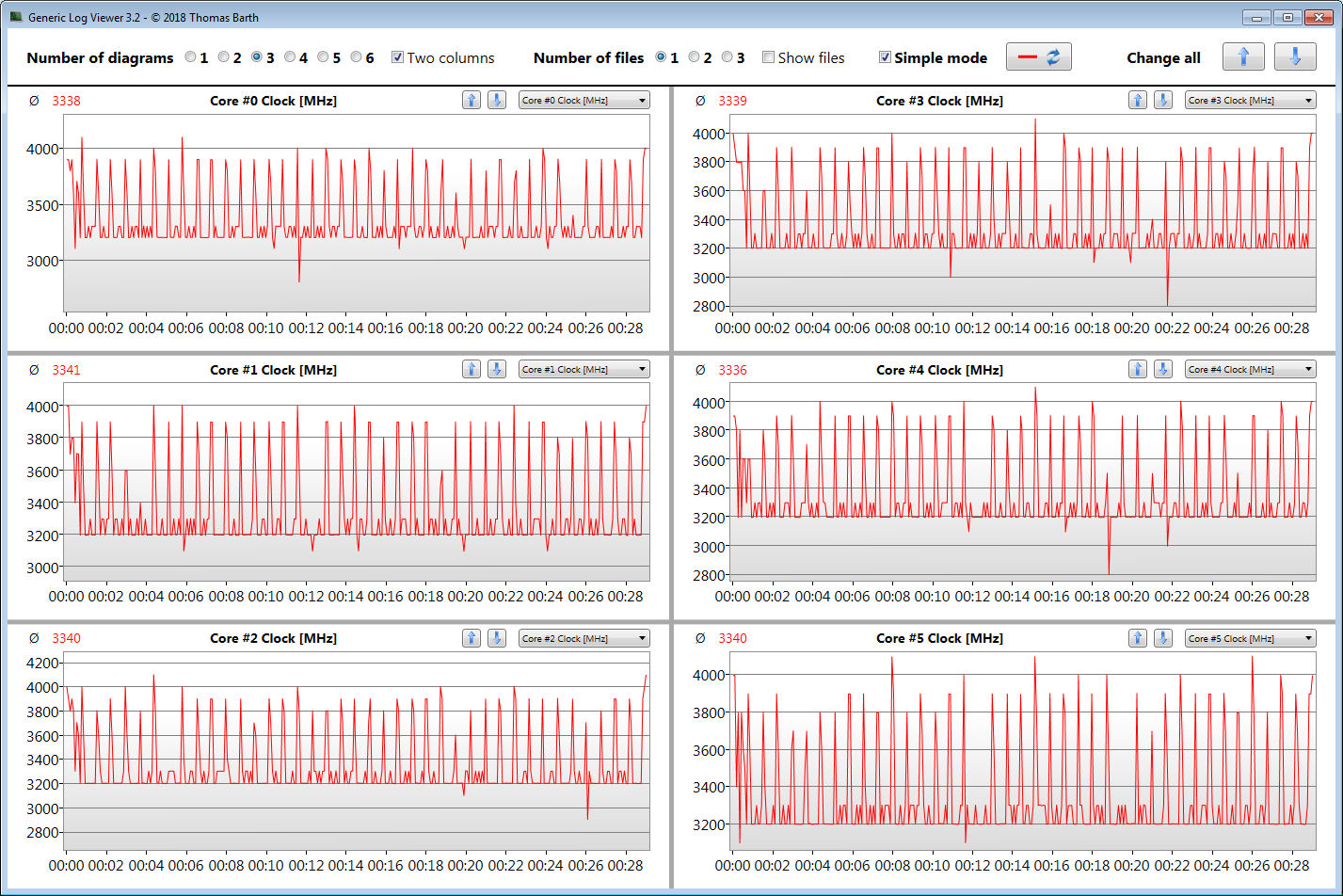 Durante i test multi-thread dei benchmarks Cinebench, il processore gira a 3,2 - 3,9 GHz per un breve periodo di tempo, prima che la velocità passi a 3,4 - 3,5 GHz. Per quanto riguarda il comportamento durante il collegamento alla rete elettrica, il test single-thread viene eseguito a 3,6 - 4,1 GHz. Durante il funzionamento con la batteria, la CPU funziona ad una frequenza costante di 1,7 GHz.