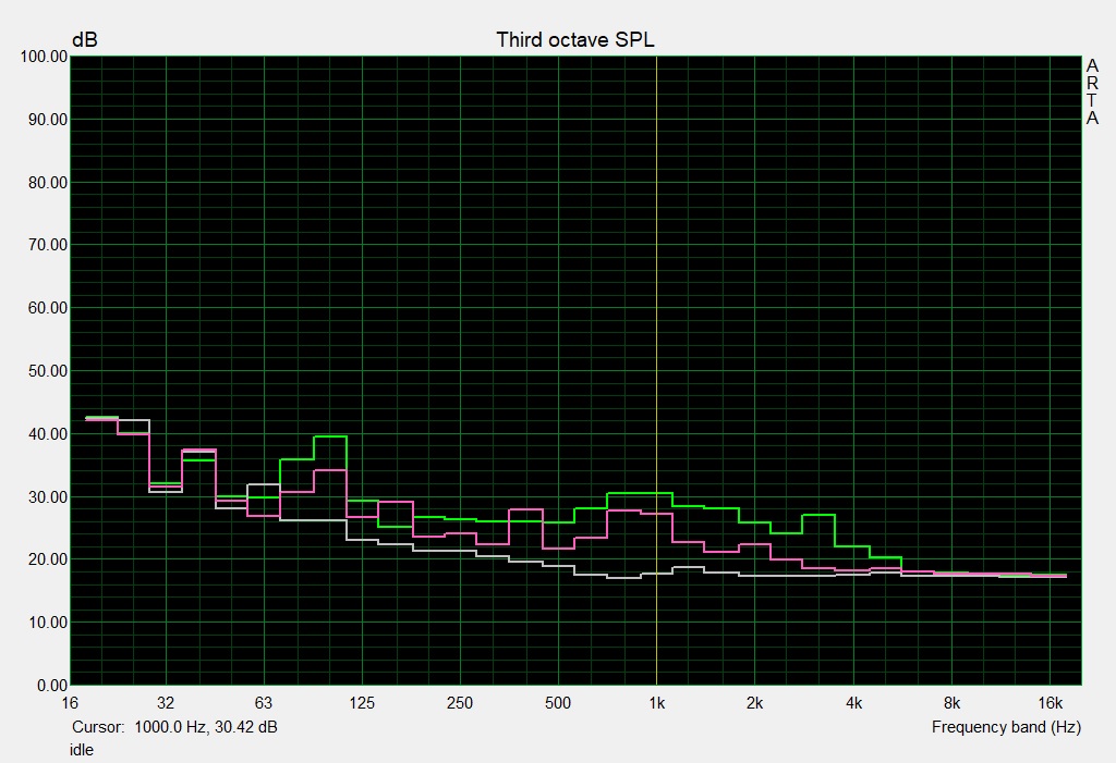| Idle Average * (dB) | 36 | 32.7 9% | 28.4 21% | 28.6 21% | 32.7 9% | 34 6% | 28.8 20% | 33.2 8% |
