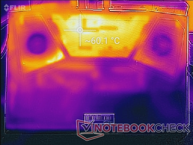 Quando si esegue Witcher 3, il centro della tastiera e la superficie inferiore possono arrivare a 40 °C e 60 °C rispettivamente. Il fondo dell'Aorus 15 ha una grande maglia che espone l'intera soluzione di raffreddamento per una maggiore ventilazione rispetto al vecchio Aorus X5. Come risultato, per fortuna solo il dissipatore arriva a 60 °C e non la rete stessa. Assicuratevi di non bloccare o impedire il flusso d'aria attraverso le numerose griglie di ventilazione.