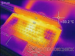 Le temperature di superficie al minimo sono piatte a un massimo di soli 28 °C verso il centro della tastiera. Poiché le ventole sono sempre in funzione e aspirano aria dagli angoli superiori della tastiera, queste aree specifiche saranno sempre più fresche, come mostrato dalle nostre mappe di temperatura riportate di seguito.