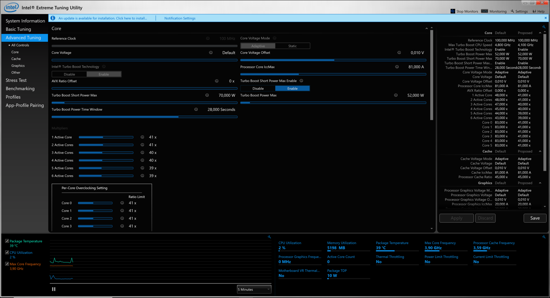 I test multithread di Cinebench hanno portato la CPU a funzionare a circa 3,7 - 4,1 GHz. I test single-thread sono stati eseguiti a 4,1 - 4,6 GHz. Questo discorso valev a solo quando era alimentato dalla rete elettrica; con la batteria, la CPU è stata costantentemente a 2,3 GHz.