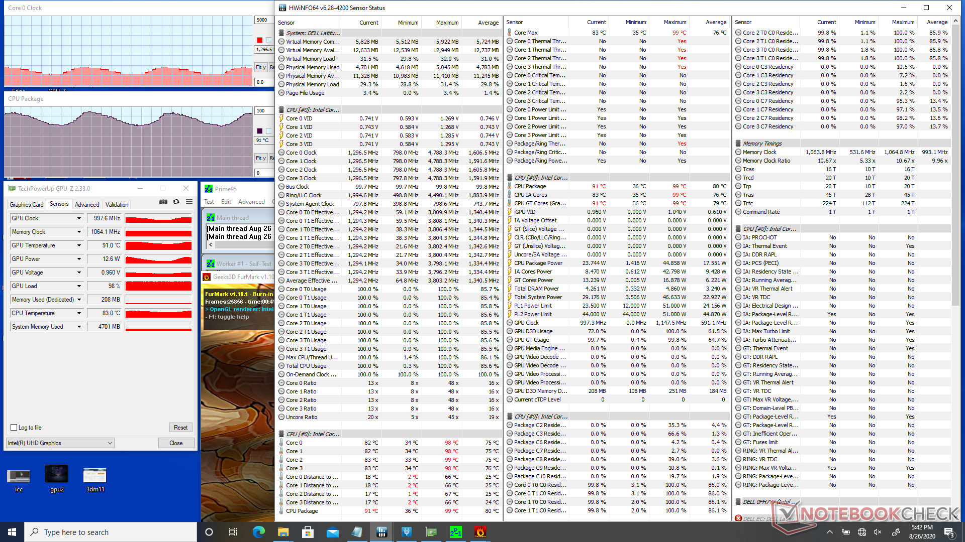 Quando si esegue Prime95 per stressare la CPU, le frequenze di clock salgono a circa 3,6 GHz per i primi due secondi fino a quando la temperatura del core raggiunge i 98 °C. Le frequenze di clock si stabilizzano poi a circa 3,0-3,1 GHz per il minuto successivo, prima di passare infine tra i 2,2 GHz e i 3,3 GHz e tra i 79 °C e i 98 °C, come mostrato dai nostri screenshots qui sotto. Questo comportamento ciclico non si nota sulla maggior parte degli altri portatili dove le frequenze di clock fisse e le temperature sono più comuni, ma Dell lo favorisce per le frequenze di clock più veloci anche se sono solo temporanee.
