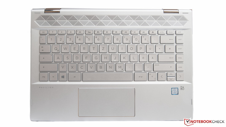 La posizione della tastiera è ora un po' più bassa, ma la disposizione della tastiera stessa è identica a quella del precedente Pavilion x360. Tuttavia, notiamo una piccola differenza sul lettering, perché i segni sui tasti freccia e i tasti normali sono ora più grandi. La tastiera è inoltre dotata di un'illuminazione a livello singolo per migliorare la visibilità in ambienti più scuri. La scritta è ora trasparente, in modo che la luce può penetrare attraverso di essa.