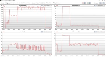 Per contro la GPU ha frequenze di clock tra 900 e 950 MHz durante lo stress test combinato, molto vicine alla frequenza di lavoro massima di 1150 MHz. Inoltre la TDP è partita da 16.5 W ma si è presto stabilizzata su 13.5 W.
