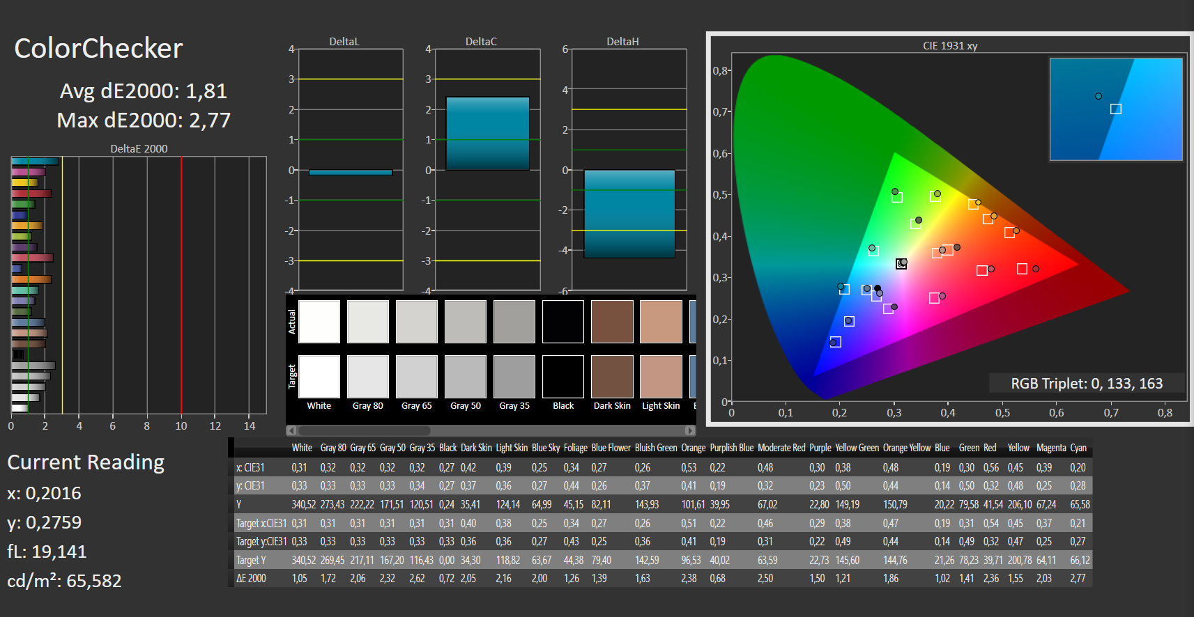 | Colorchecker dE 2000 * | 1.81 | 3.2 -77% | 2.99 -65% | 4.33 -139% | 2.03 -12% | 4.63 -156% |