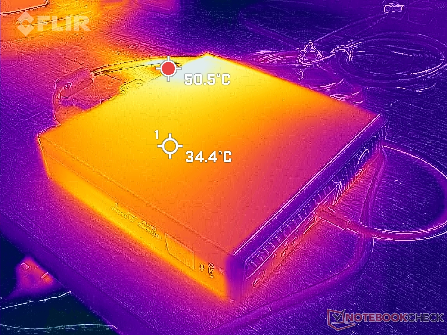 Le temperature superficiali possono essere piuttosto calde, in quanto il modello ospita una CPU di classe desktop in un esterno prevalentemente metallico. La superficie superiore raggiunge i 30-35 C quando si naviga semplicemente sul web, mentre può raggiungere i 51 C quando si eseguono carichi impegnativi. Dovrà sicuramente prestare attenzione alla temperatura se appoggia degli oggetti sopra l'unità.