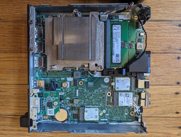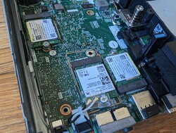Il pannello superiore si sfila facilmente dopo aver rimosso una sola vite a testa zigrinata dalla parte posteriore, per rivelare il modulo WLAN rimovibile e due slot SSD. La ventola deve essere rimossa per accedere ai due slot SODIMM, ma l'intero processo è senza attrezzi per facilitare la manutenzione.