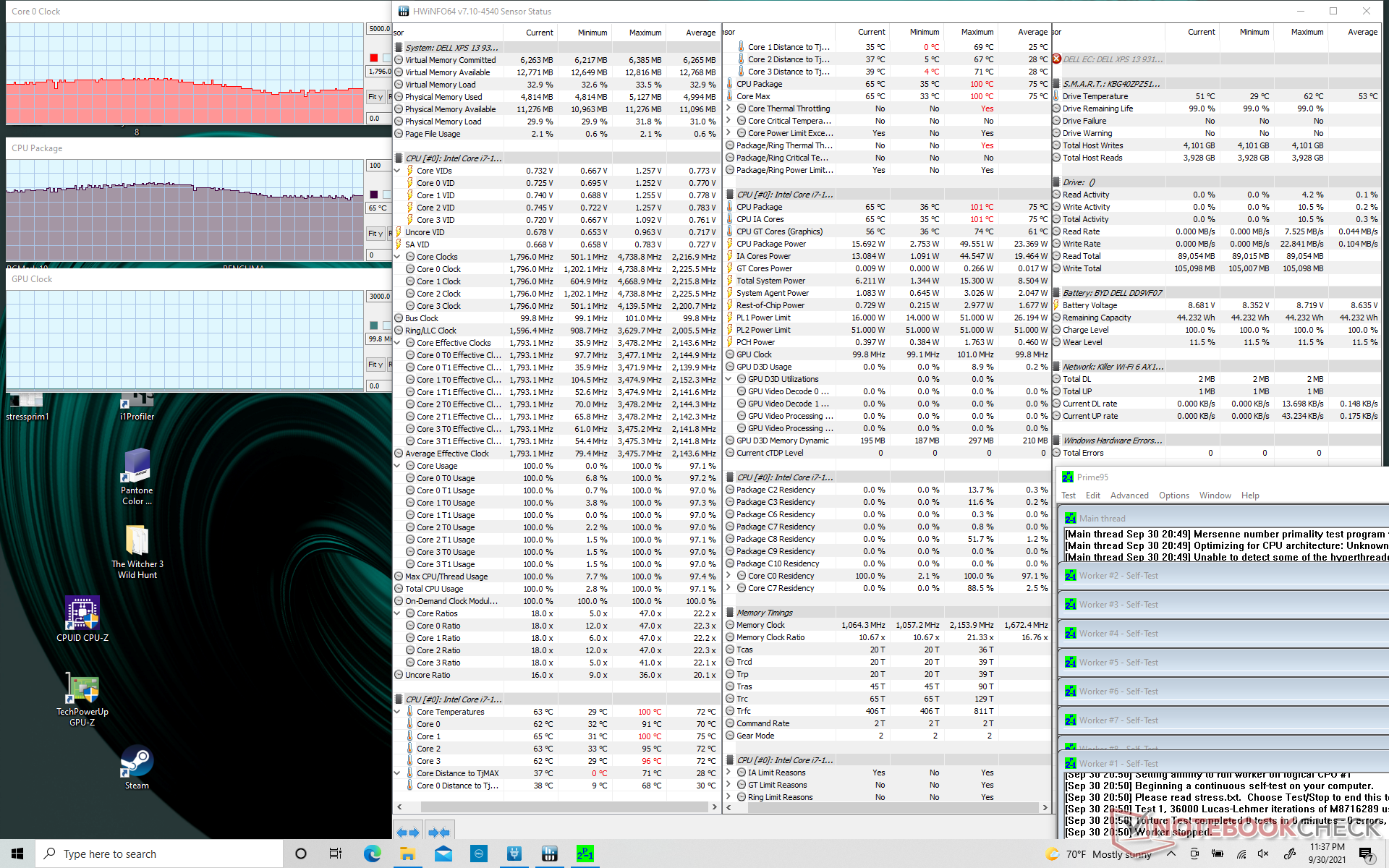 Quando si stressa con Prime95, le frequenze di clock della CPU e la temperatura raggiungono un picco e rimangono stabili fino a 2,9 GHz e 100 C per il primo paio di minuti. In seguito, le frequenze di clock e la temperatura scendevano e si stabilizzavano rispettivamente tra 1,8 e 2,2 GHz e tra 66 e 75 C, anche quando si impostava la modalità Ultra Performance tramite il software Dell Power Manager. In confronto, l'XPS 13 7390 2-in-1 alimentato da Ice Lake si stabilizzava a frequenze di clock del core e temperature più alte. Quindi, sembra che il più recente XPS 13 9310 2-in-1 stia puntando a temperature del core più basse, anche se al costo di maggiori prestazioni Turbo Boost. I tassi di clock ciclici sotto stress rispecchiano i nostri punteggi del ciclo CineBench R15 xT di cui sopra