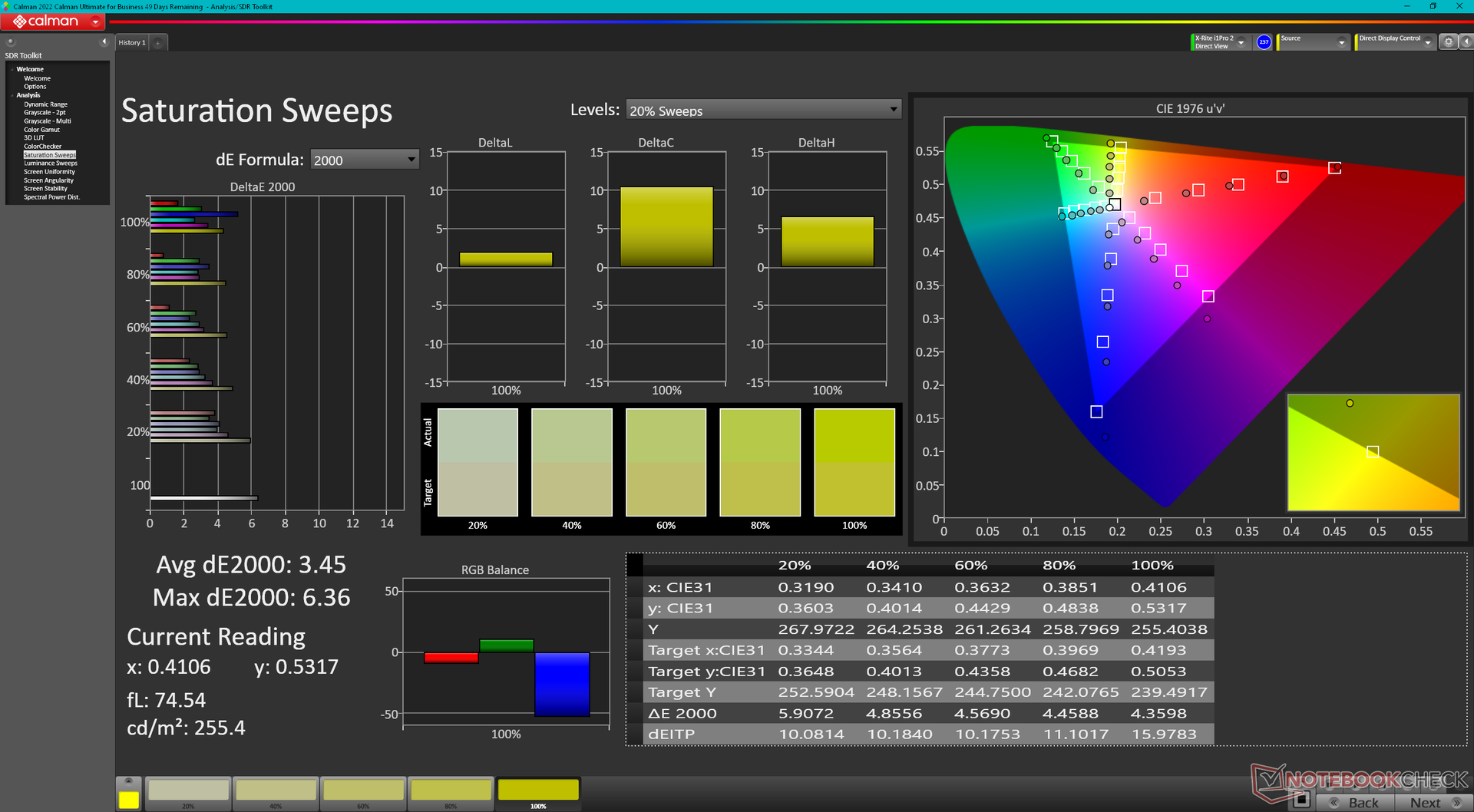 | Colorchecker dE 2000 calibrated * | 1.26 | 0.45 64% | 1.4 -11% | 0.56 56% | ||