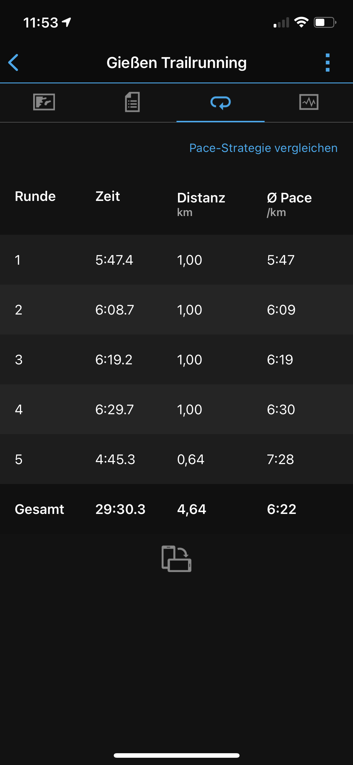 Poiché l'Enduro manca dei dati cartografici necessari - in contrasto con le capacità del Fenix 6 Pro - questi calcoli non avvengono sull'orologio ma sullo smartphone. Da lì, è possibile trasferirli a selezionati orologi sportivi Garmin come l'Enduro o il Forerunner 745 . La schermata qui sotto di un vero percorso di trail dimostra la modalità PacePro. Le schermate seguenti mostrano la preparazione sullo smartphone e le visualizzazioni sull'Enduro.
