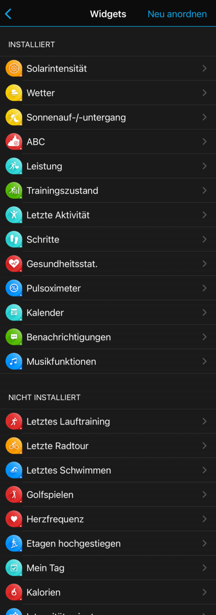 Diversamente dal modo in cui siamo abituati con i dispositivi dotati di touchscreen, i widgets non occupano tutto lo schermo con Garmin. Invece, formano un elenco verticale, ciascuno con una panoramica informativa dell'app corrispondente, come si può vedere nell'immagine qui sotto a sinistra.