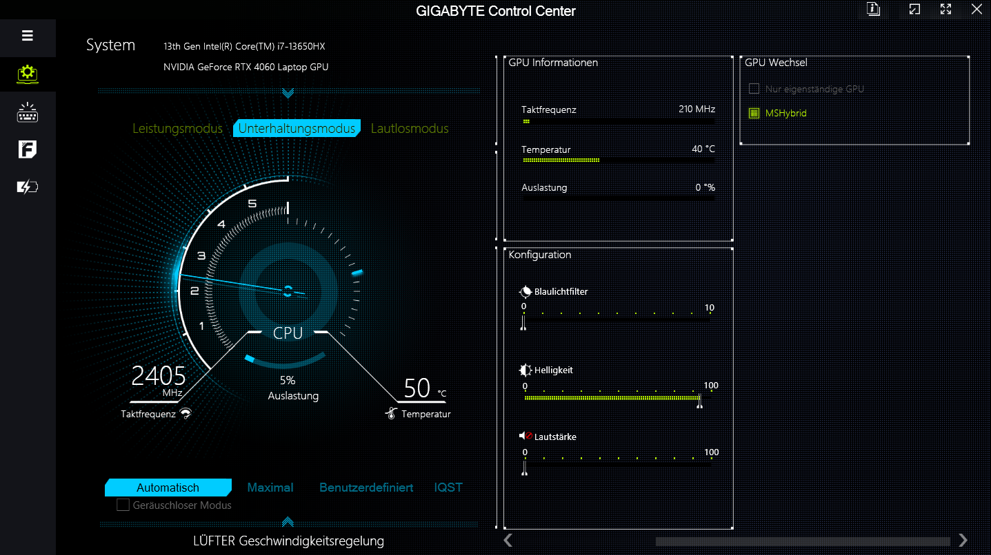Tuttavia, ciò va a discapito delle prestazioni, in quanto la dGPU non funziona in questo modo. In generale, la modalità Intrattenimento è consigliata per l'uso quotidiano. Oltre il pieno carico, lo sviluppo del rumore rimane a un livello moderato.