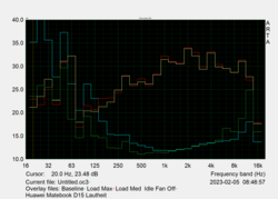 Indipendentemente dalla posizione, il MateBook D 15 rimane eccezionalmente fresco, ben al di sotto dei 40°C. IlThinkPad E15 G3 AMDè molto più silenzioso, ma il suo case raggiunge temperature molto elevate (fino a 61 °C). In alcuni casi, quasi tutti gli altri dispositivi della concorrenza raggiungono temperature più elevate del MateBook.