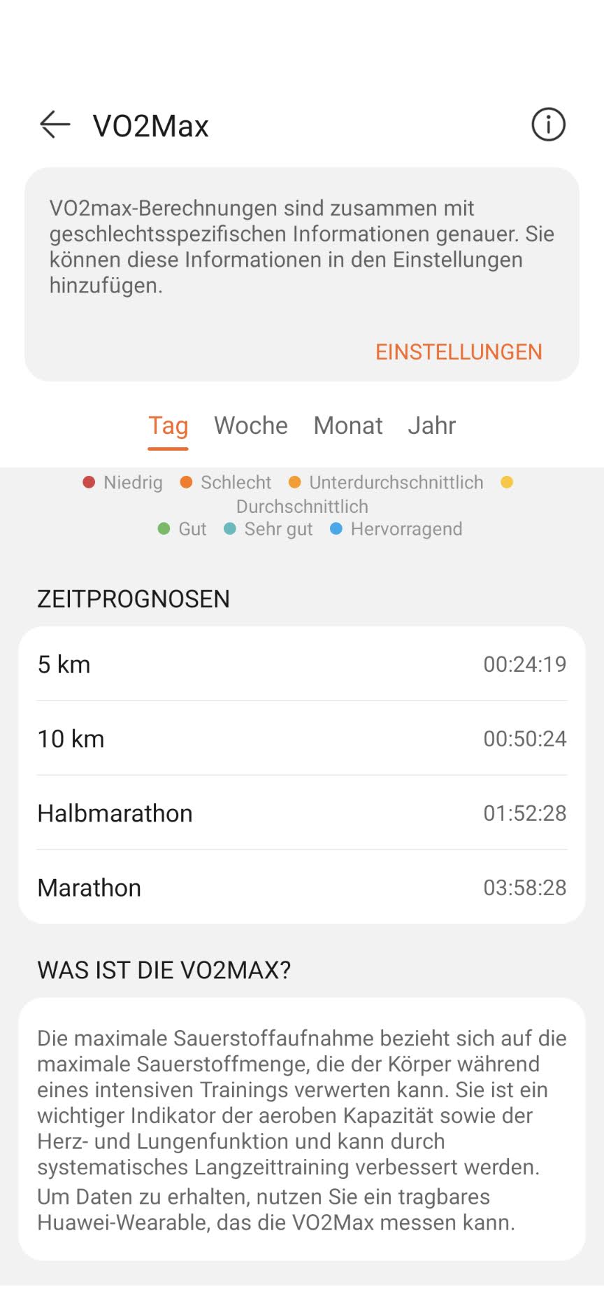 Tuttavia, tutti questi valori e calcoli possono essere ottenuti solo quando si va a correre con il compagno di fitness. Queste informazioni specifiche mancano per altri sport. Se il compagno intelligente rileva che non vi state più muovendo, anche se l'allenamento è ancora in corso, vi chiederà dopo qualche minuto se volete terminare l'allenamento. Una sincronizzazione con Google Fit non è possibile. Anche se l'app Salute appare come una possibile fonte in Google Fit, non è possibile stabilire una connessione. Su iOS, è possibile sincronizzare i dati tra Apple Health e Huawei Health. L'app offre anche un'esportazione di dati GPX e TCX.