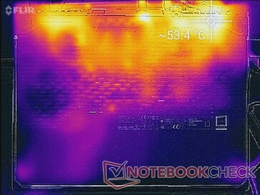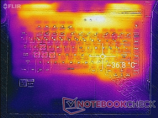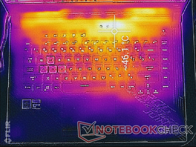 Le temperature di superficie non diventano mai troppo elevate, indipendentemente dal carico sullo schermo. Anche se i punti caldi possono arrivare a 46 °C - 53 °C quando si gioca, queste aree si trovano verso la parte posteriore, lontano dai tasti della tastiera e dai poggiapolsi.