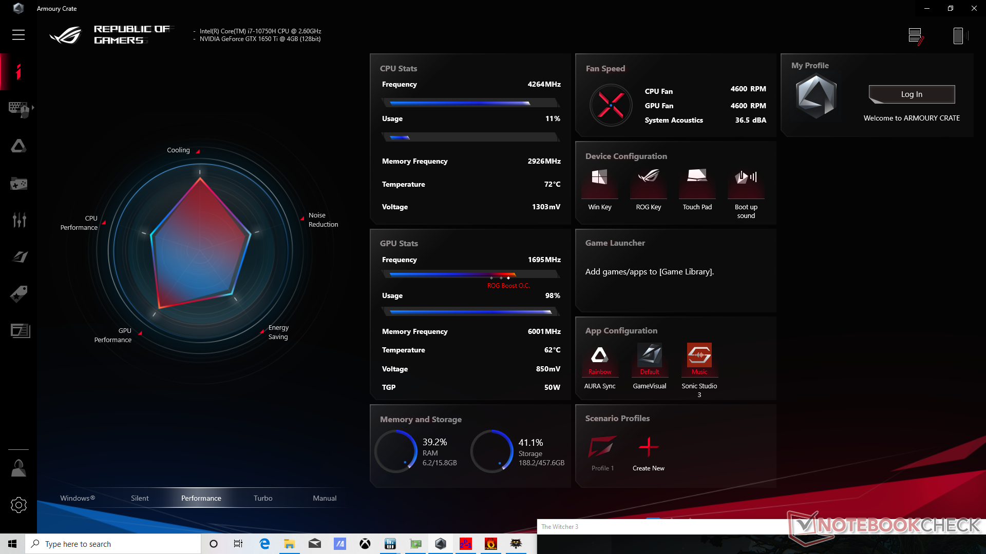 Eseguendo The Witcher 3 in modalità Turbo di Asus, la CPU e la GPU si stabilizzano a 61 °C e 60 °C, rispettivamente, con una frequenza di clock della GPU di 1755 MHz. La velocità di clock della GPU scende appena leggermente a 1695 MHz quando si esegue in modalità performance senza grandi cambiamenti nel rumore della ventola, così gli utenti possono anche giocare in modalità Turbo quando possibile. Queste temperature sono relativamente basse poiché questo particolare telaio è stato costruito per gestire opzioni GPU più veloci fino a RTX 2070 Super.