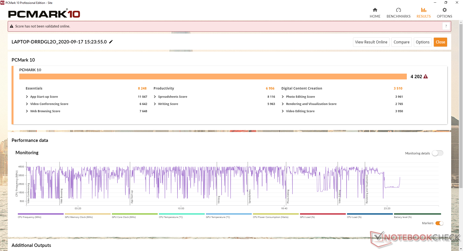 Quando si esegue Prime95 per stressare la CPU, le frequenze di clock arrivano a 3,3 - 3,4 GHz per circa 30-40 secondi ad una temperatura del core di 93 °C. Successivamente, le frequenze di clock diminuiscono ed oscillano tra 2,1 GHz e 3 GHz e tra 69 °C e 87 °C, rispettivamente, per mantenere le temperature a livelli più confortevoli. Questo comportamento ciclico non è comune, ma può essere osservato anche sulla serie Dell XPS.