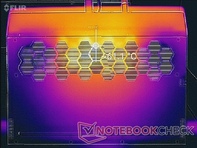 Quando si gioca o si eseguono carichi estremi, le temperature di superficie possono raggiungere oltre 50° C vicino al centro della tastiera, in modo simile a quanto registrato sull'MSI GS66. Anche i tasti WASD diventano caldi, ma non abbastanza da risultare scomodi al tatto.