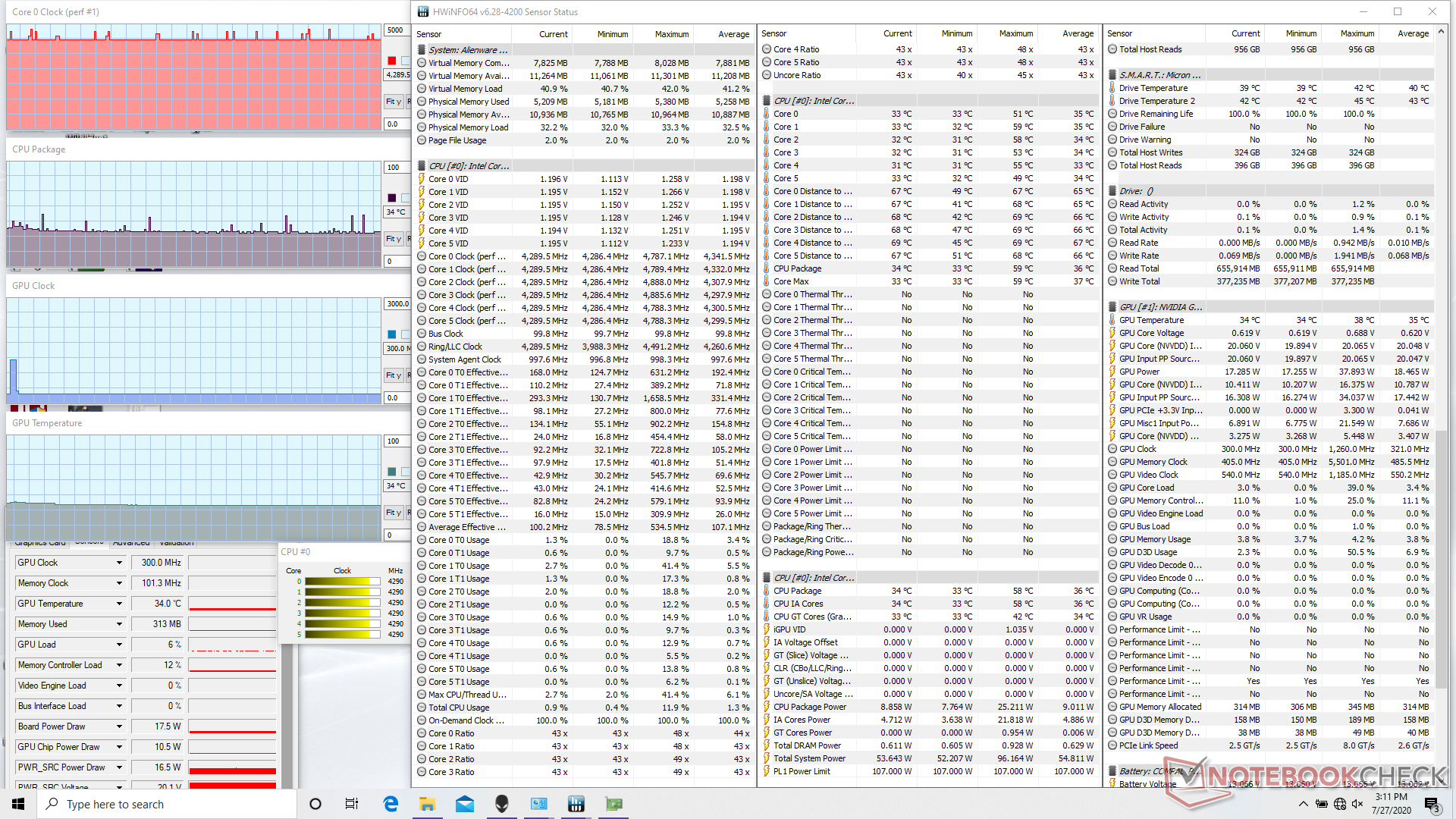 Quando si esegue Prime95, le frequenze di clock raggiungono i 4,4 GHz per un paio di secondi prima di stabilizzarsi a 4,2 GHz e ad una temperatura del core di 81 °C. L'esecuzione sia di Prime95 che di FurMark farà sì che la CPU funzioni a 99 °C, come nella maggior parte degli altri sistemi Alienware e XPS 15/17. L'elevata temperatura del core è il prezzo da pagare per l'eccellente sostenibilità delle prestazioni della CPU di cui abbiamo parlato sopra.