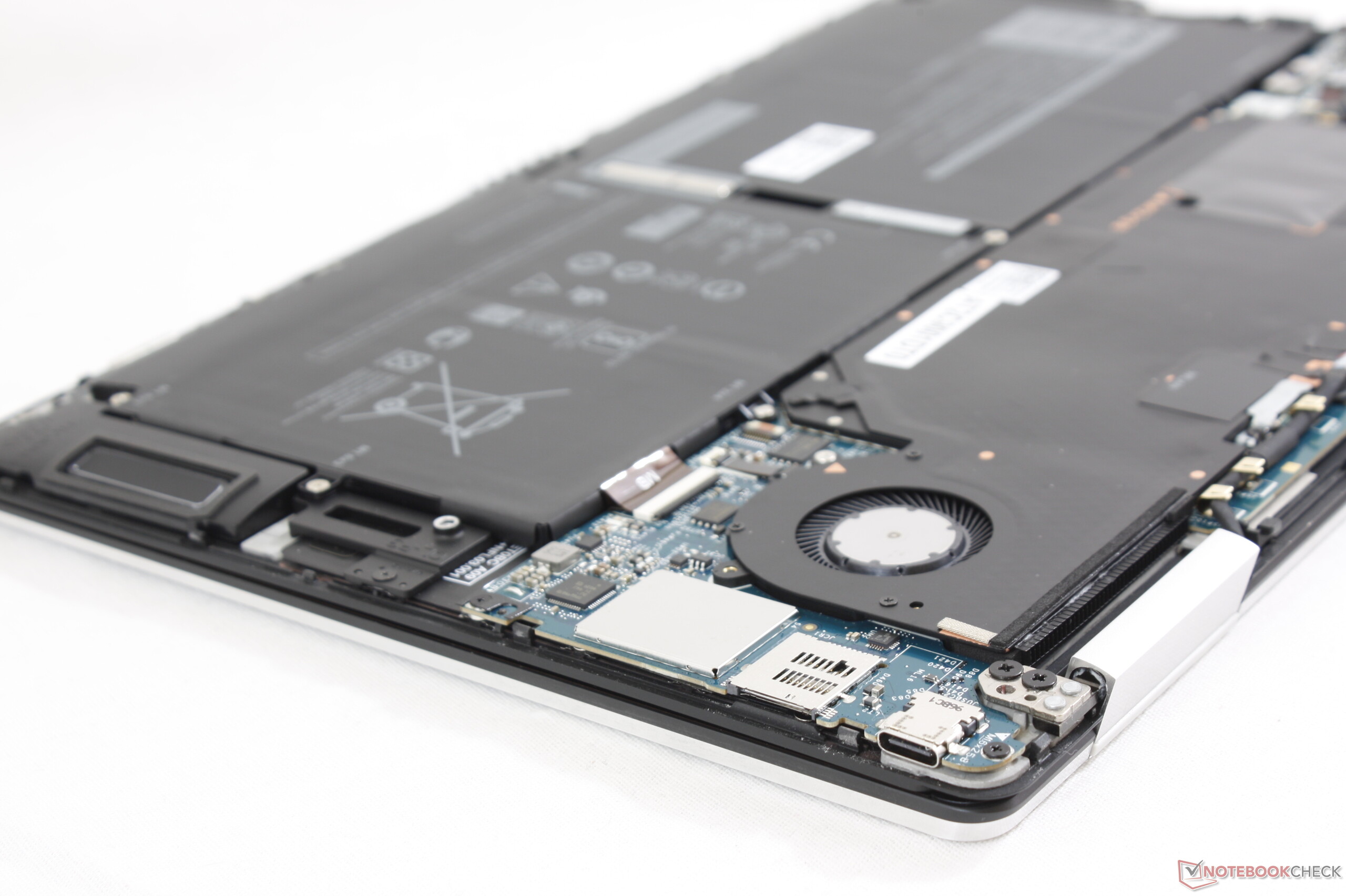 Il pannello inferiore è fissato da otto viti torx T5. E' abbastanza chiaro che Dell scoraggia gli utenti dal manomettere il sistema perché il pannello inferiore è molto stretto intorno ai bordi ed è quindi più difficile da rimuovere rispetto al guscio a conchiglia dell'XPS 13. Una volta all'interno, non c'è nulla da aggiornare dato che la RAM, la WLAN e persino l'SSD sono tutti saldati.