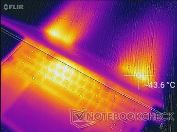 Le temperature di superficie sono quasi le stesse di quelle registrate sul modello base XPS 15 7590 Core i5. In caso di carichi estremi, il centro della tastiera può diventare caldo come 43 °C, mentre il fondo può avvicinarsi a 40 °C. Se si eseguono applicazioni impegnative, il sistema deve essere posizionato su una scrivania piatta, perché il fondo metallico si riscalda notevolmente.