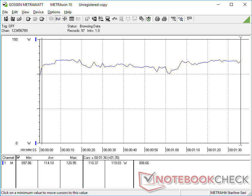 Siamo in grado di registrare un consumo massimo di 135,2 W durante l'esecuzione simultanea di Prime95 e FurMark. Questo alla fine diminuisce e fluttua prima di stabilizzarsi definitivamente a circa 89 W.