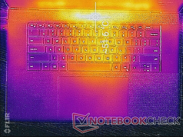 I punti caldi quando si eseguono carichi elevati per lunghi periodi possono raggiungere fino a 51° C e 41° C sulle superfici superiore e inferiore del portatile, rispettivamente. Questi stessi punti arrivano da 34° C a 37° C anche quando sono al minimo sul desktop. Tuttavia, i punti caldi sono concentrati verso il centro posteriore dello chassis mentre i poggiapolsi rimangono molto più freddi. Questo è simile a quello che abbiamo osservato sul Razer Blade Pro 17 ma in misura ancora maggiore sul Dell.