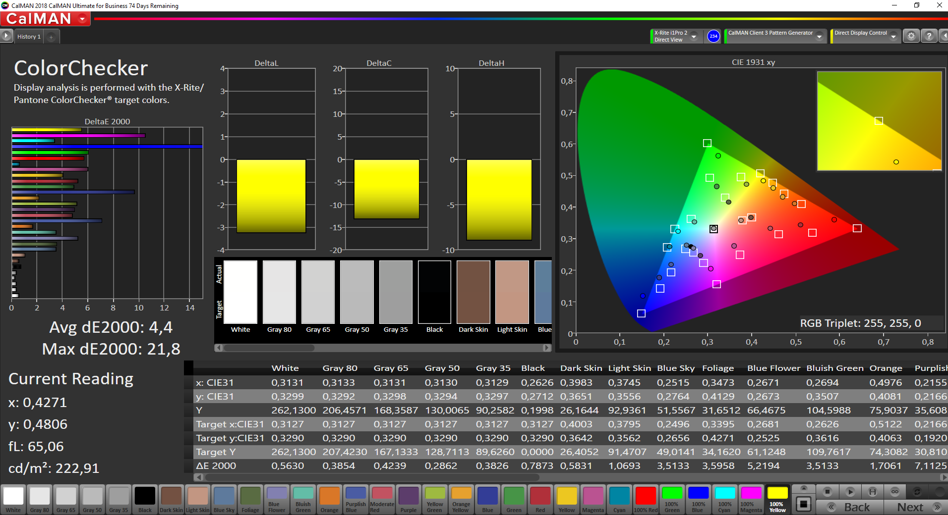 | Colorchecker dE 2000 max. * | 21.3 | 6.59 69% | 18.6 13% | 18.08 15% | 17.8 16% |