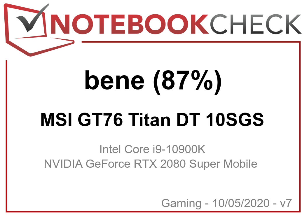 | 87.4 % v7 (old) | 10/2020 | MSI GT76 Titan DT 10SGS i9-10900K, GeForce RTX 2080 Super Mobile | 4.2 kg | 42 mm | 17.30" | 3840x2160 | |