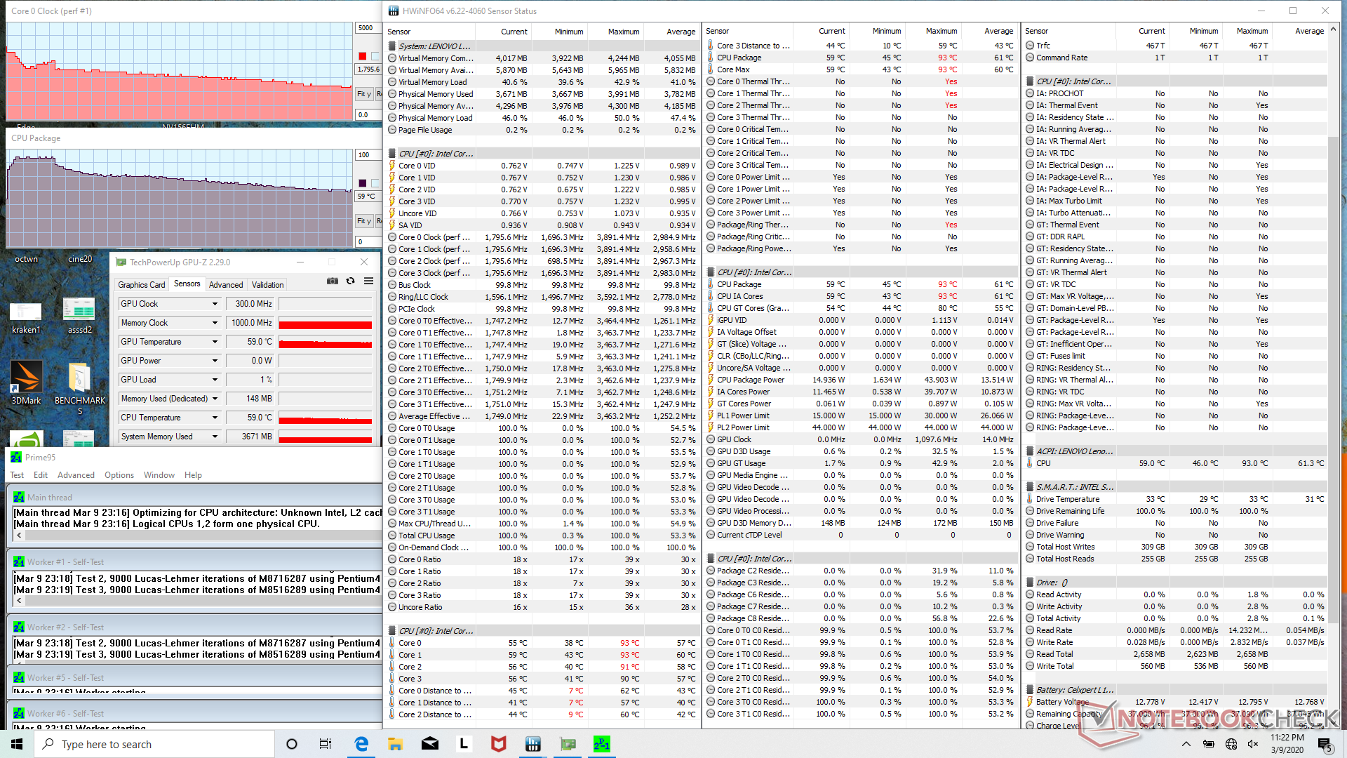 La scarsa sostenibilità delle prestazioni menzionate nella nostra sezione dedicata alle CPU può essere spiegata con HWiNFO. Quando si esegue Prime95, i clock rate aumentano fino a 3,5 GHz solo per i primi 5 secondi circa fino a raggiungere una temperatura del core di 93 °C. In seguito, i clock rate scendono costantemente nel tempo fino a 2,9 GHz prima di stabilizzarsi definitivamente a soli 1,7 GHz e a una temperatura del core di ~ 54 °C. Se si considera che il clock rate di base del Core i7-1065G7 è di 1,3 GHz, il boost di 400 MHz è deludente. L'XPS 13 2-in-1 con la stessa CPU si stabilizza a 3,0 GHz quando si trova nelle stesse condizioni.