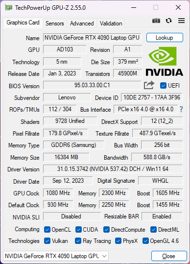 | 90.2 % v7 (old) | 10/2023 | Lenovo Legion 9 16IRX8 i9-13980HX, GeForce RTX 4090 Laptop GPU | 2.6 kg | 22.7 mm | 16.00" | 3200x2000 | |