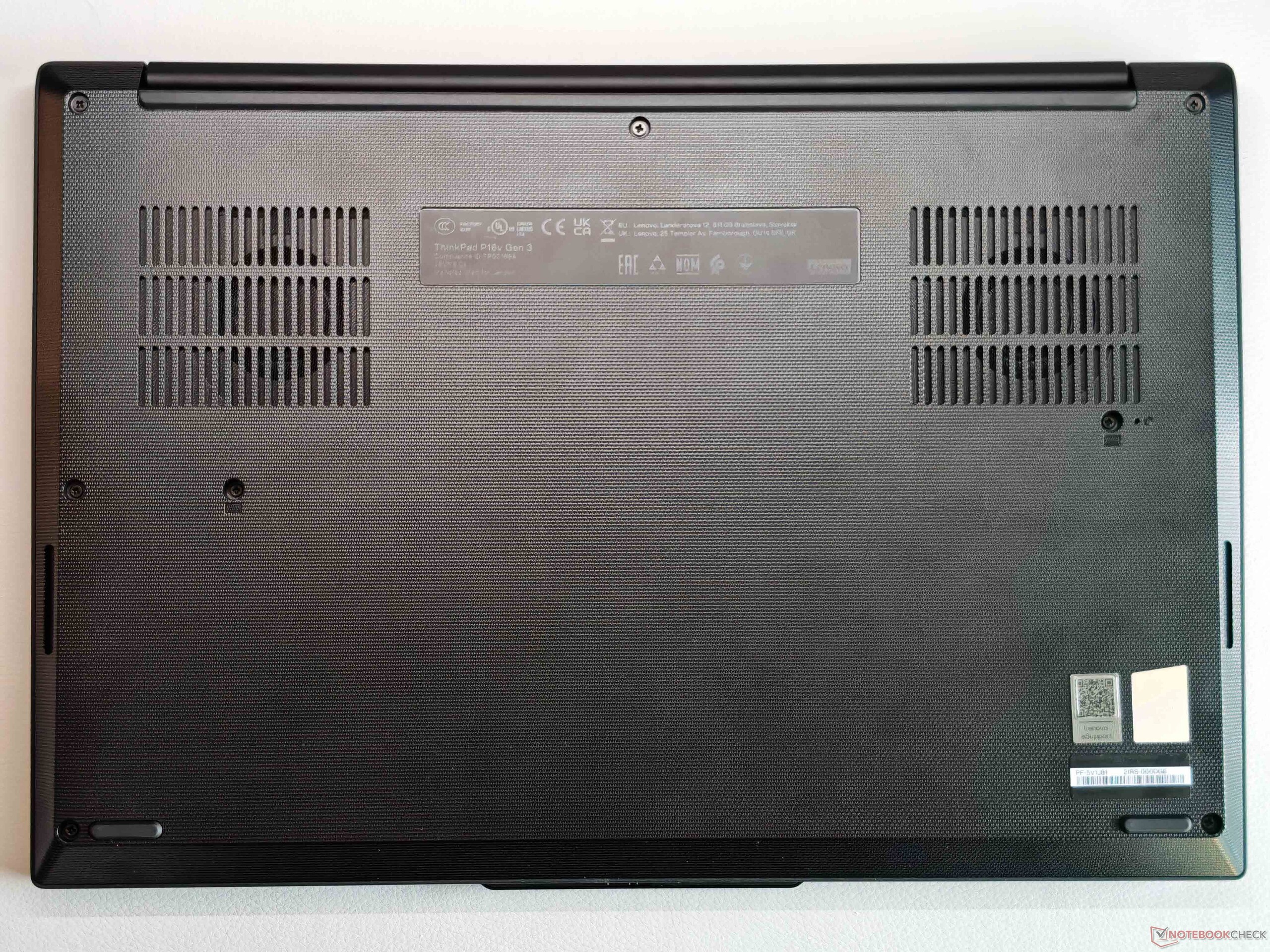 Nonostante il prezzo elevato, la classificazione come workstation entry-level è evidente nell'involucro, in quanto viene utilizzata solo plastica. Il design è tipico degli attuali ThinkPad, compresa l'antiestetica gobba della fotocamera. La lavorazione è sostanzialmente buona, ma la stabilità è deludente, soprattutto se si considera l'unità base piuttosto spessa. L'area centrale della tastiera, in particolare, può essere visibilmente ammaccata, ma non siamo riusciti a provocare alcun rumore di scricchiolio. Il coperchio del display si comporta meglio, ma le cerniere rimbalzano un po' (angolo di apertura massimo 180 gradi). Il coperchio liscio, in particolare, è molto sensibile alle impronte digitali ed è anche difficile da pulire. Le opzioni di manutenzione sono complessivamente molto buone (2x RAM, 2x SSD).