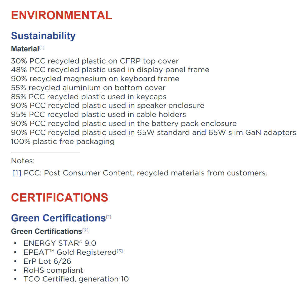 Il ThinkPad X13 G6 soddisfa diversi standard ambientali, tra cui Energy Star, e Lenovo fornisce ampie informazioni sull'impronta di carbonio del dispositivo e sull'uso di materiali riciclati. L'imballaggio è completamente riciclabile e non contiene plastica.