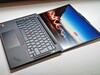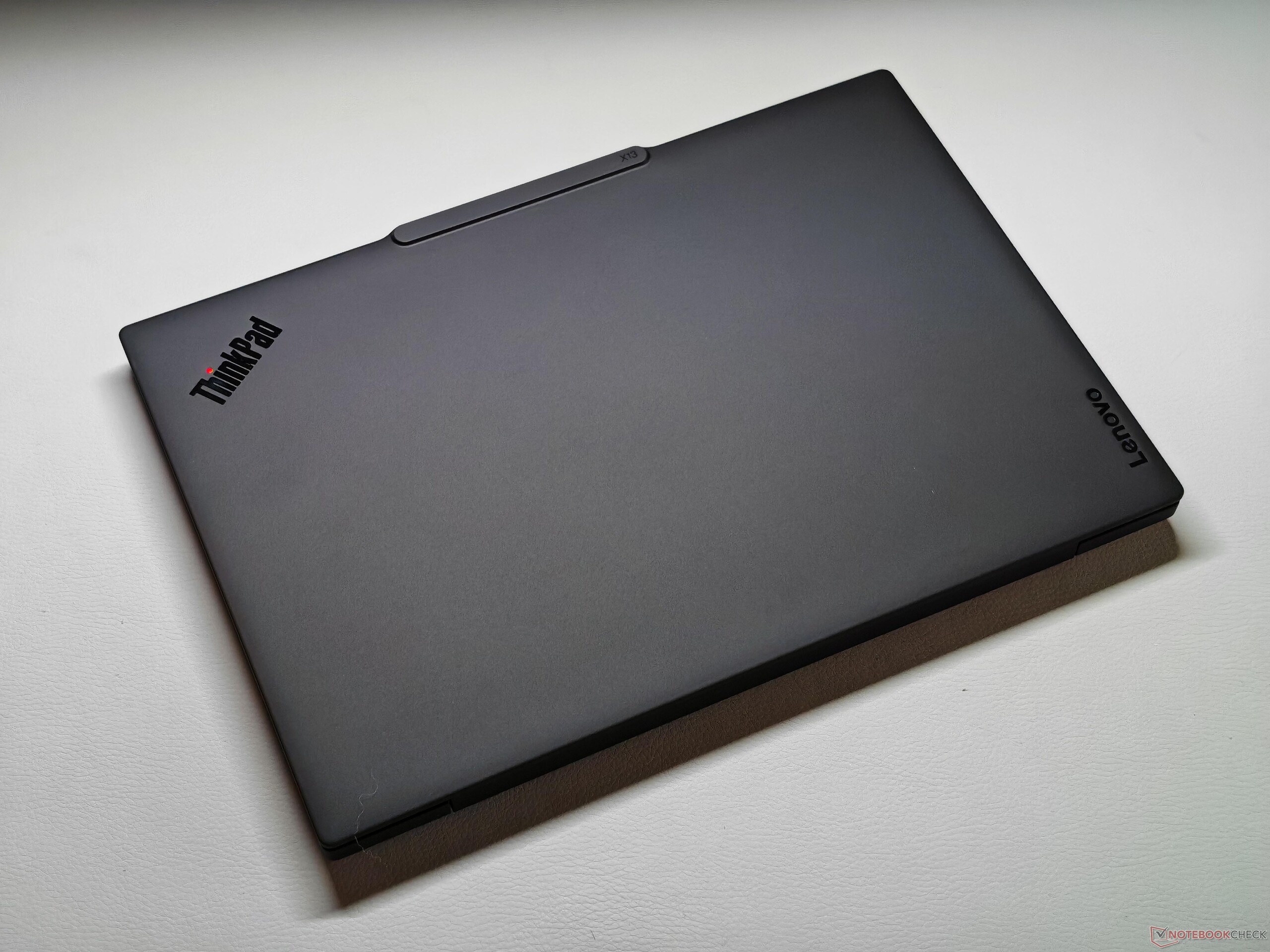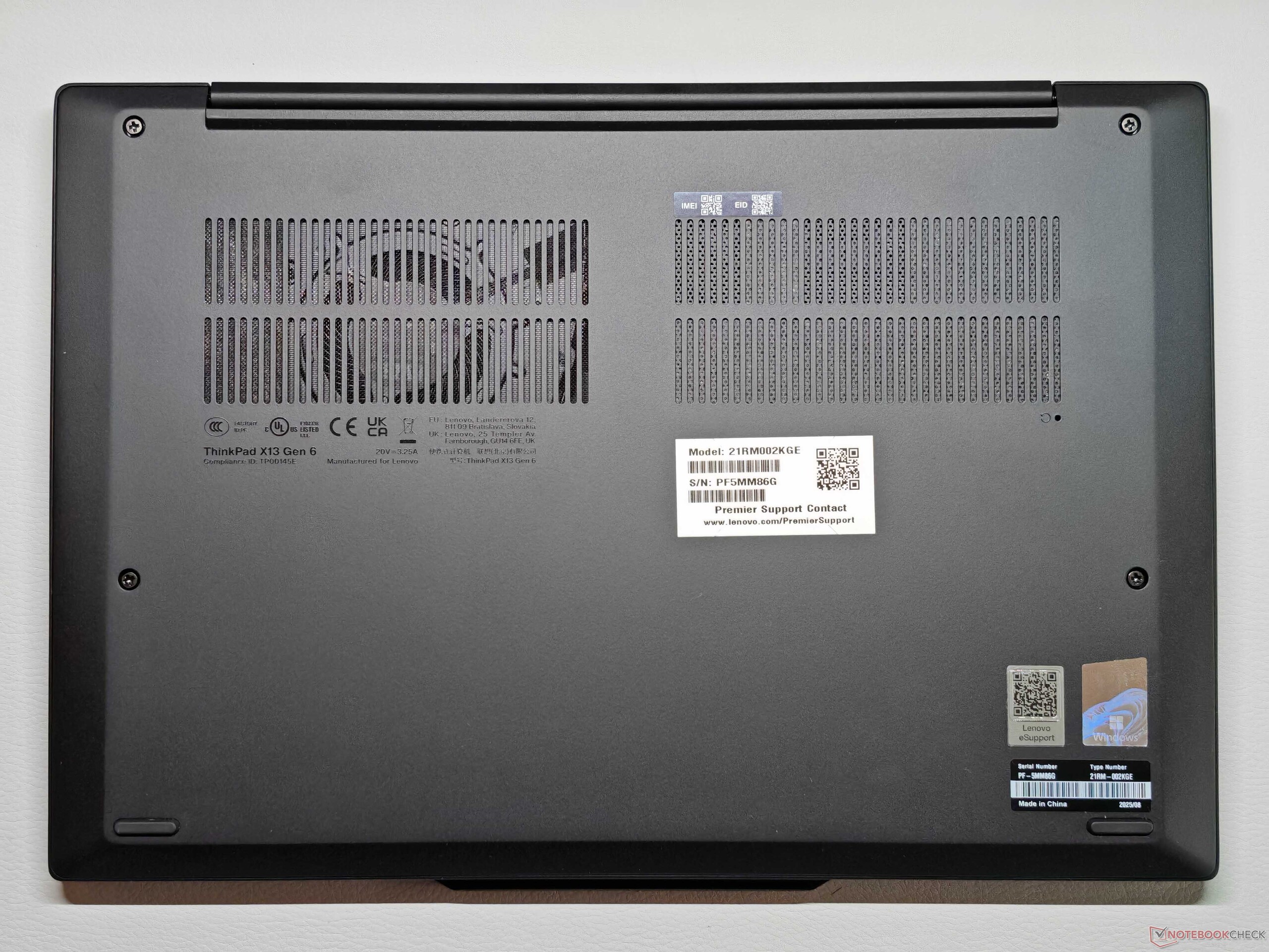 Visivamente, il nuovo X13 G6 è inconfondibilmente un ThinkPad e segue l'attuale linguaggio di design, compreso l'alloggiamento della fotocamera piuttosto prominente. Maneggiando il dispositivo, si notano subito le dimensioni compatte e il peso ridotto. Le superfici hanno una finitura leggermente strutturata che dà una sensazione di qualità, non è eccessivamente incline alle impronte digitali ed è relativamente facile da pulire. Il coperchio è realizzato in plastica rinforzata con fibra di carbonio e l'unità di base è in alluminio. Tuttavia, l'attenzione alla mobilità ha un impatto sulla rigidità complessiva. L'unità base può essere leggermente schiacciata nell'area centrale e produce lievi scricchiolii quando viene ruotata. Il coperchio stesso è ragionevolmente robusto, ma le cerniere sono il problema principale. L'angolo di apertura massimo è di 180 gradi, ma le cerniere sono un po' troppo allentate e oscillano troppo. Il coperchio inferiore è fissato con solo quattro viti ed è facile da rimuovere. La ventola, la batteria, il modulo WWAN e l'SSD sono riparabili, anche se la RAM e il modulo WLAN sono saldati.