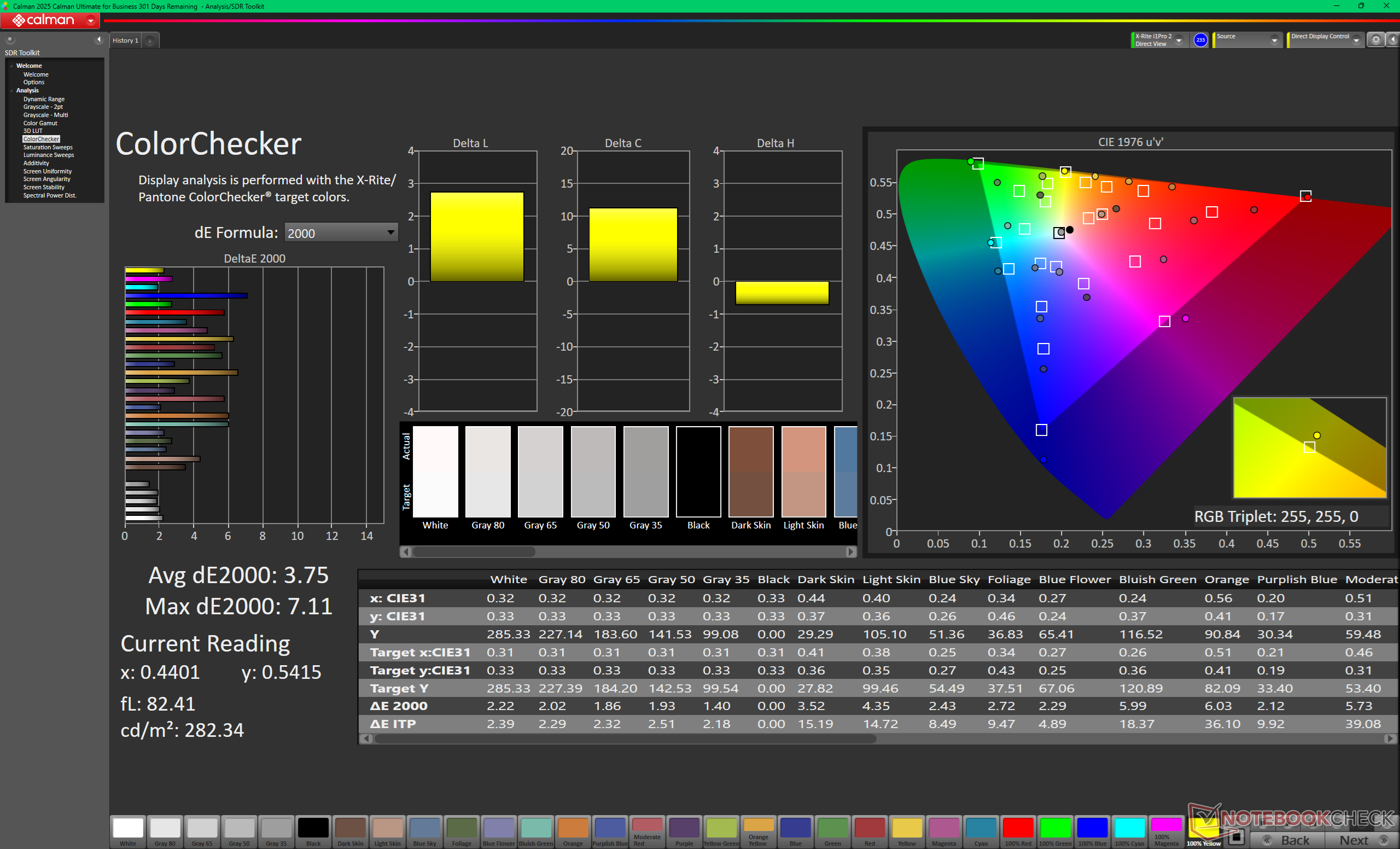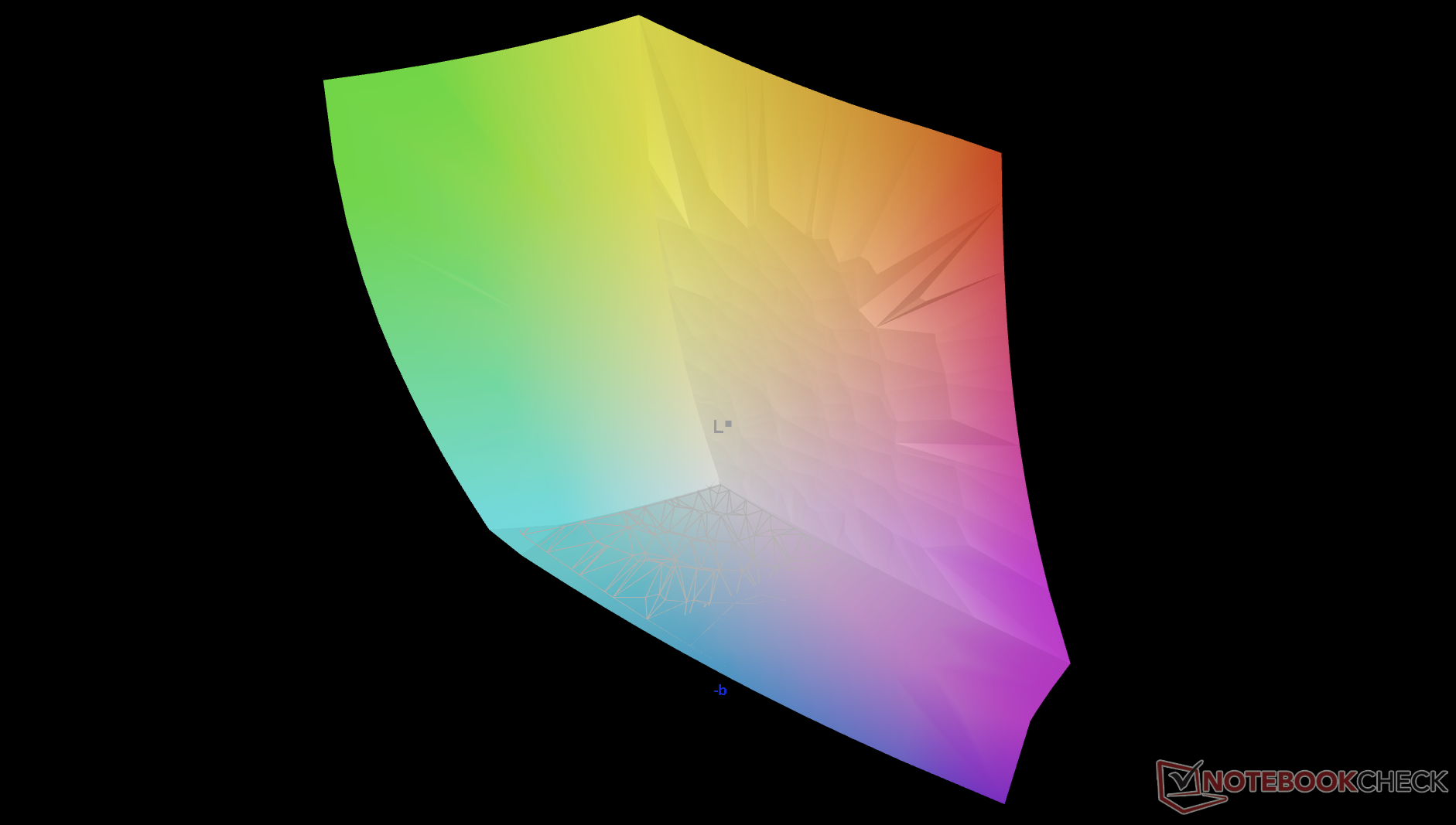 Il display è ben calibrato, soprattutto per un modello di fascia media. I valori medi di deltaE della scala di grigi e del colore rispetto allo standard P3 sono rispettivamente solo 1,3 e 3,75, quindi un'ulteriore calibrazione produrrebbe solo miglioramenti minimi.