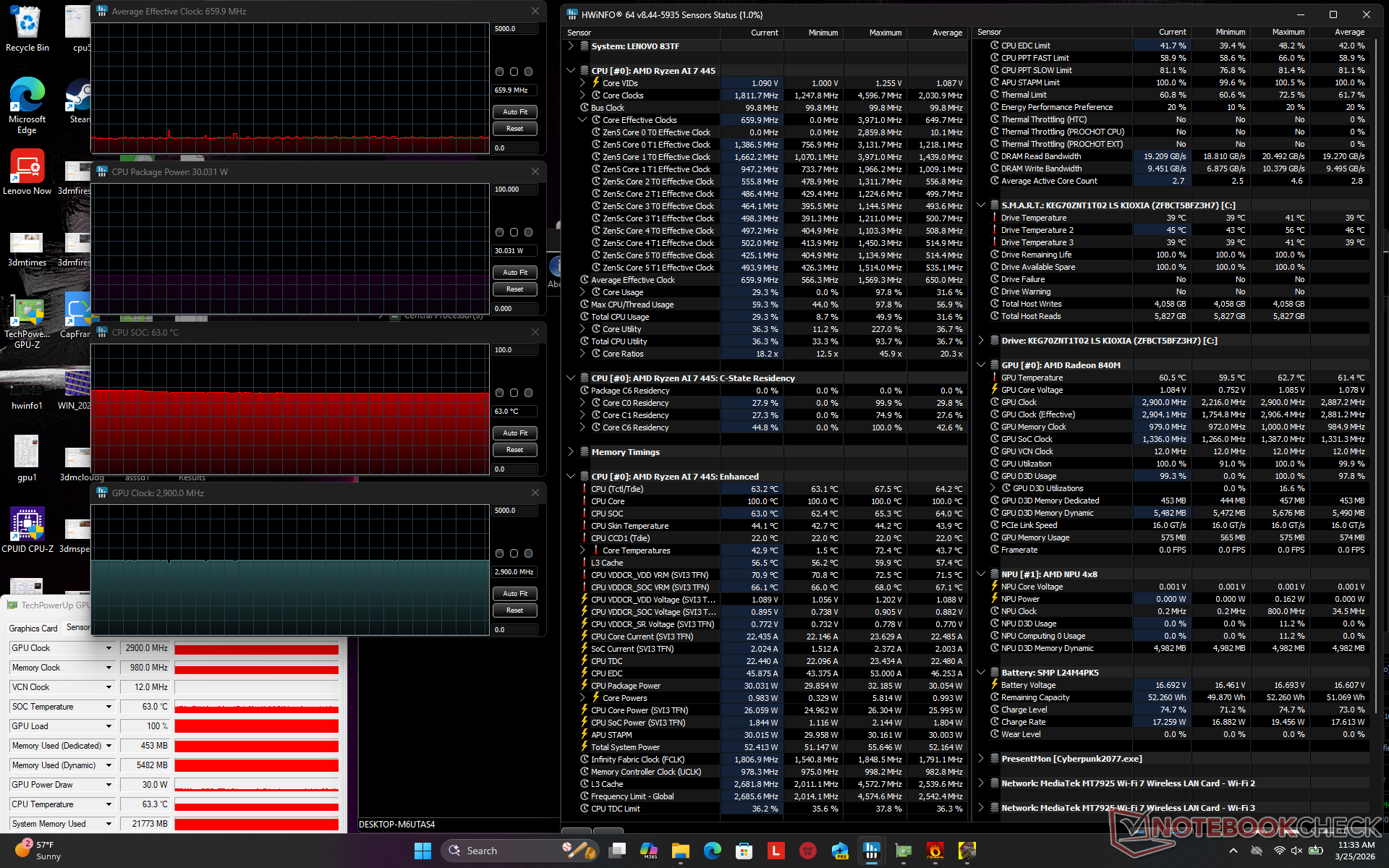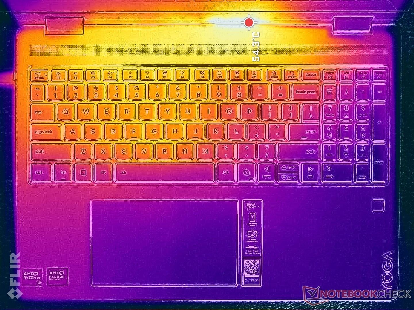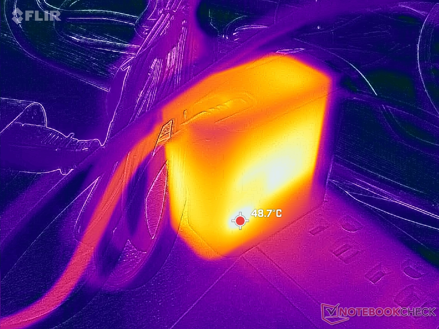 Le temperature di superficie possono essere più calde rispetto alla configurazione Lunar Lake-V. Quando si eseguono carichi impegnativi come i giochi, ad esempio, i punti caldi sul piano tastiera e sul coperchio inferiore possono raggiungere rispettivamente oltre 48 C e 45 C, rispetto ai 43 C e 37 C dell'opzione Intel.