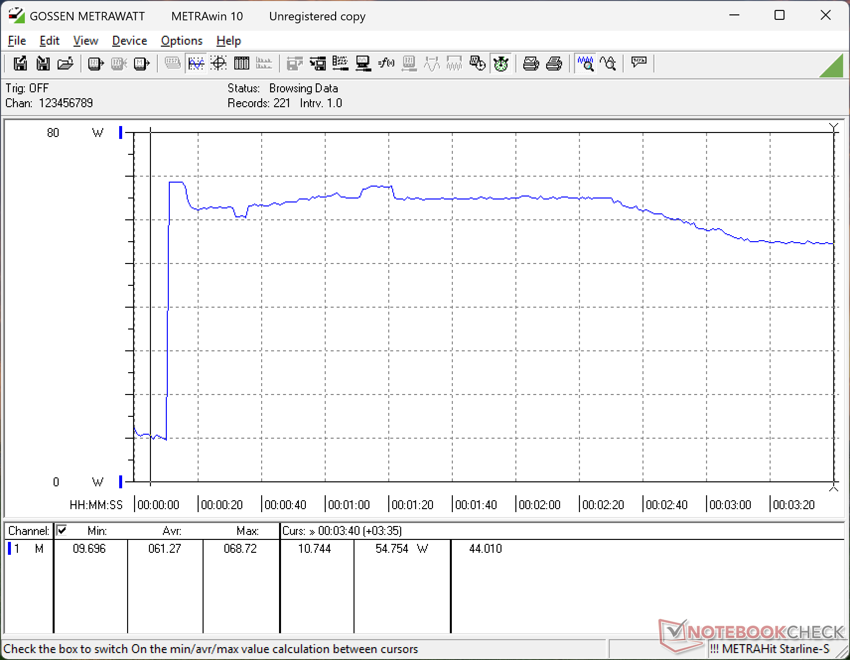 Siamo in grado di misurare un assorbimento massimo temporaneo di 69 W dal piccolo (~5,5 x 5,5 x 2,9 cm) adattatore CA USB-C da 65 W quando la CPU è completamente sollecitata.