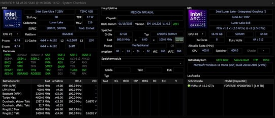 | Medion SPRCHRGD 14 S2 Intel Core Ultra 7 258V ⎘ Intel Arc Graphics 140V ⎘ 32 GB Memoria | Prezzo di listino: 1300 EUR | 1.4 kg | 17 mm | 14.00" 2880x1800 243 PPI IPS | |