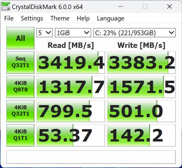 Il nostro dispositivo di prova contiene un SSD da 1 TB di un produttore sconosciuto. In ogni caso, l'SSD M.2 si è collegato tramite l'interfaccia PCIe, permettendoci di raggiungere velocità di trasferimento comparativamente elevate nel test. Ciò significa che Acemagic può assicurarsi il secondo posto con l'AD15. Tuttavia, abbiamo riscontrato dei problemi sotto carico continuo. Le prestazioni dell'SSD non possono essere mantenute costantemente al livello iniziale. È possibile installare un secondo dispositivo di archiviazione di massa nel dispositivo; è ancora disponibile uno slot libero da 2,5 pollici.