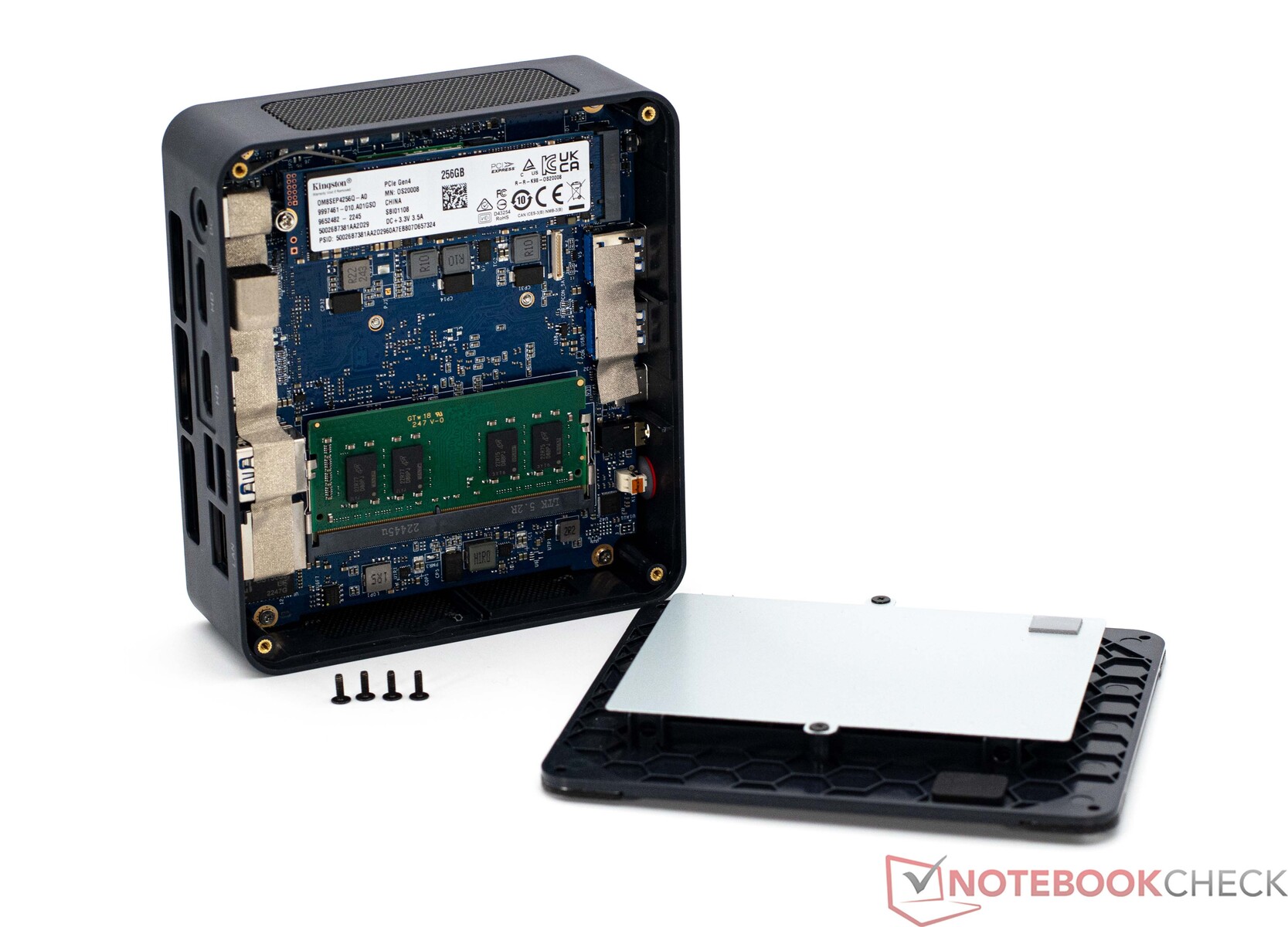 In pratica, è possibile eseguire operazioni di manutenzione sul Mini PC Bosgame. A tale scopo, la base del dispositivo può essere aperta con relativa facilità. La piastra di base è fissata da quattro piccole viti. Tuttavia, le possibilità di espansione sono limitate all'installazione di un solo dispositivo di memoria di massa aggiuntivo in formato da 2,5 pollici. Il modulo Wi-Fi, l'unità SSD M.2 e la RAM sono tutti intercambiabili.