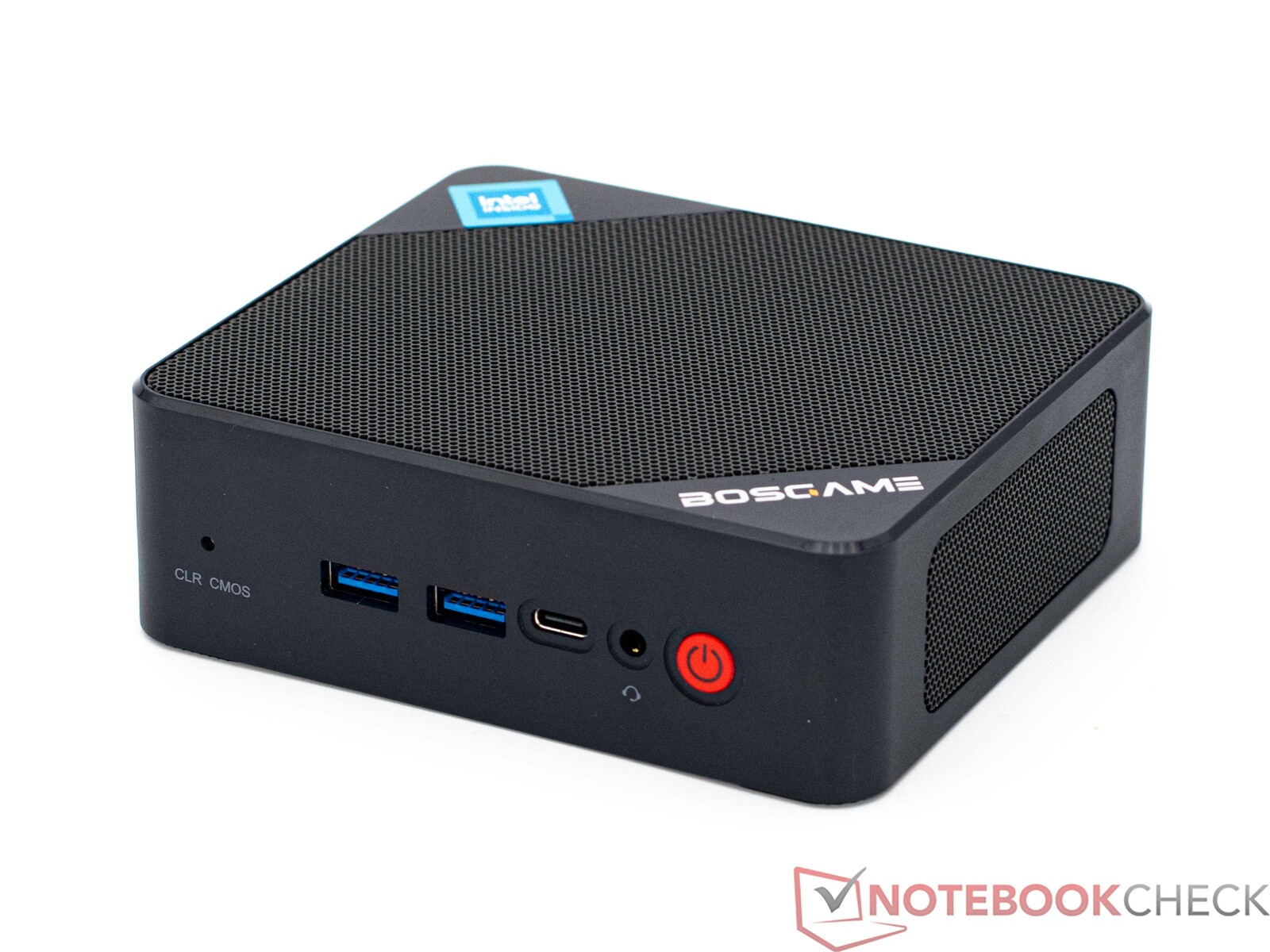 Il Mini PC Bosgame è costituito principalmente da plastica, ma questo è abbastanza accettabile considerando il suo prezzo. Tuttavia, il produttore non ha scelto di utilizzare il metallo per la rete che fornisce aria fresca al sistema. Questa è integrata nei lati e nella parte superiore del dispositivo e, dal punto di vista del design, si adatta perfettamente all'aspetto generale. Sebbene si tratti di un dispositivo a basso prezzo, le rifiniture sono buone e non presentano problemi. L'involucro è stato verniciato in tonalità grigio-blu e le griglie delle ventole sono di colore antracite. I punti di forza visivi, se così si possono chiamare, sono le scritte Bosgame sulla parte superiore del dispositivo e il pulsante di accensione sulla parte anteriore. Quest'ultimo si presenta come un pulsante di arresto di emergenza grazie al suo sorprendente colore rosso.