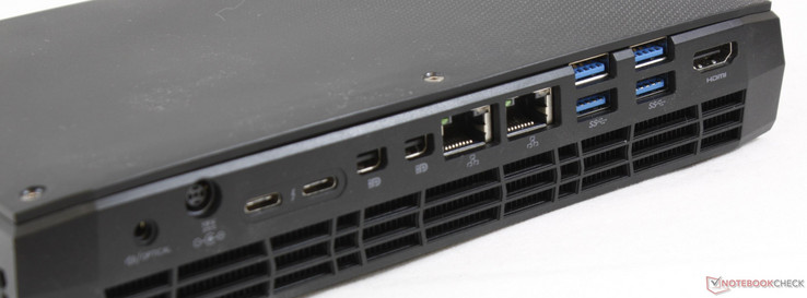 Intel non ha lasciato che le dimensioni più grandi andassero sprecate e c'è un numero elevato di porte disponibili. Ci sono almeno due di quasi tutte le porte, tra cui Thunderbolt 3, Gigabit RJ-45, mini-DisplayPort, HDMI e USB, per essere più di quello che i più grandi PC SFF offrono come il MSI Trident 3 o Asus GR8 II. La spaziatura tra le porte è uniforme se non un po' stretta lungo la parte posteriore. La GPU Vega M può collegare fino a 6 display 4K indipendenti simultaneamente solo sulla SKU di fascia alta. In futuro vorremmo vedere una porta HDMI-in per stabilire ulteriormente il NUC come un sistema multimediale domestico.