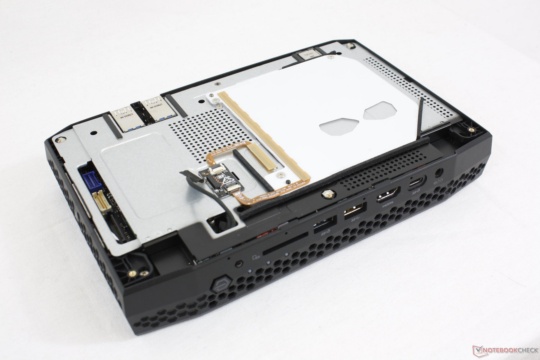 Una volta aperto, gli utenti hanno accesso diretto a 2 slot DDR4 SODIMM, 2 alloggiamenti di archiviazione M.2 2280 e alla batteria del BIOS. Per raggiungere il processore dall'altra parte della scheda madre è necessario smontare ulteriormente l'unità.
