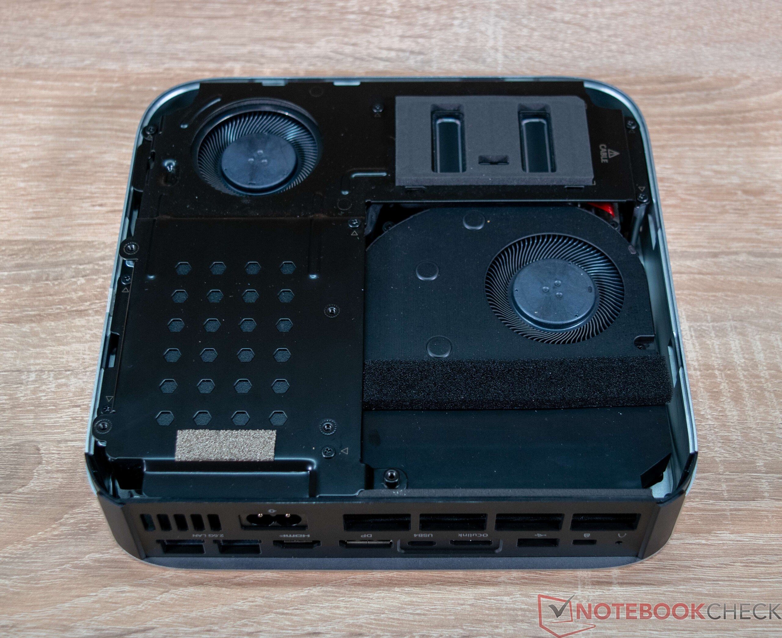 La manutenzione e l'aggiornamento di Minisforum AI X1 Pro sono relativamente semplici. La base è fissata con poche viti, una delle quali è nascosta sotto una copertura di gomma. L'unità (composta dall'alimentatore e dall'altoparlante) deve essere rimossa per accedere alla RAM e alla memoria di massa, e i suoi cavi corti significano che dovrà prestare attenzione quando lo farà. La RAM, il modulo Wi-Fi e l'SSD sono sostituibili. Sono inoltre disponibili due slot M.2 2280 liberi per ulteriori SSD.