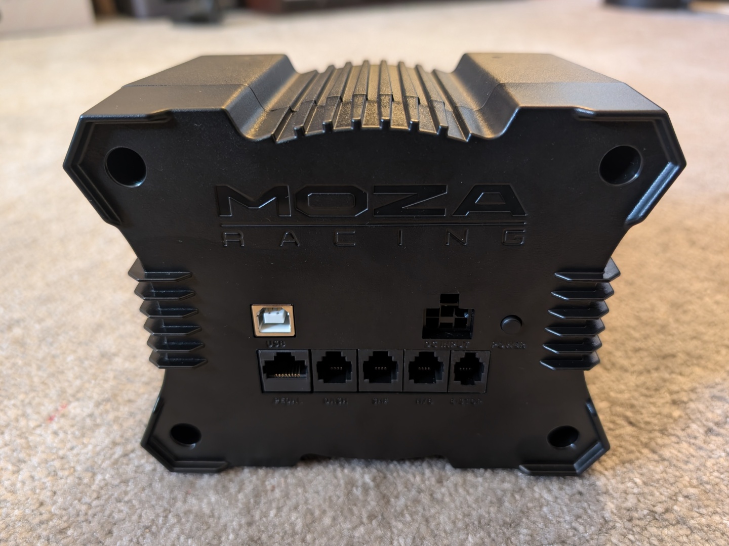 Per quanto riguarda l'interasse stesso, l'alloggiamento completamente nero è realizzato in lega di alluminio di grado aeronautico, che sembra robusto. Ci sono quattro fori per le viti nella parte inferiore, che consentono il montaggio su scrivania e sim rig. Ci sono anche due fori per le viti nella parte superiore per il montaggio di un accessorio per il cruscotto. Sul retro, c'è un pulsante di accensione, un ingresso DC, un connettore USB Tipo-B per il cavo del PC e cinque porte per gli accessori. La parte anteriore presenta l'albero del motore e il meccanismo di connessione rapida e Moza afferma che il passo R5 è compatibile con la maggior parte dei suoi volanti e sistemi di pedali.