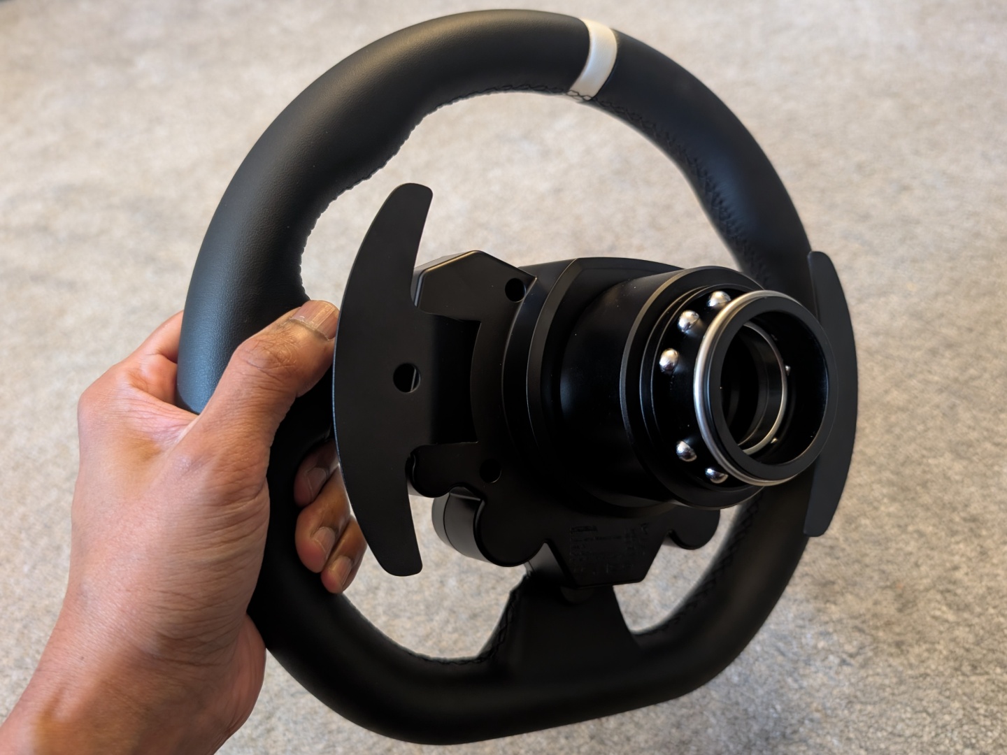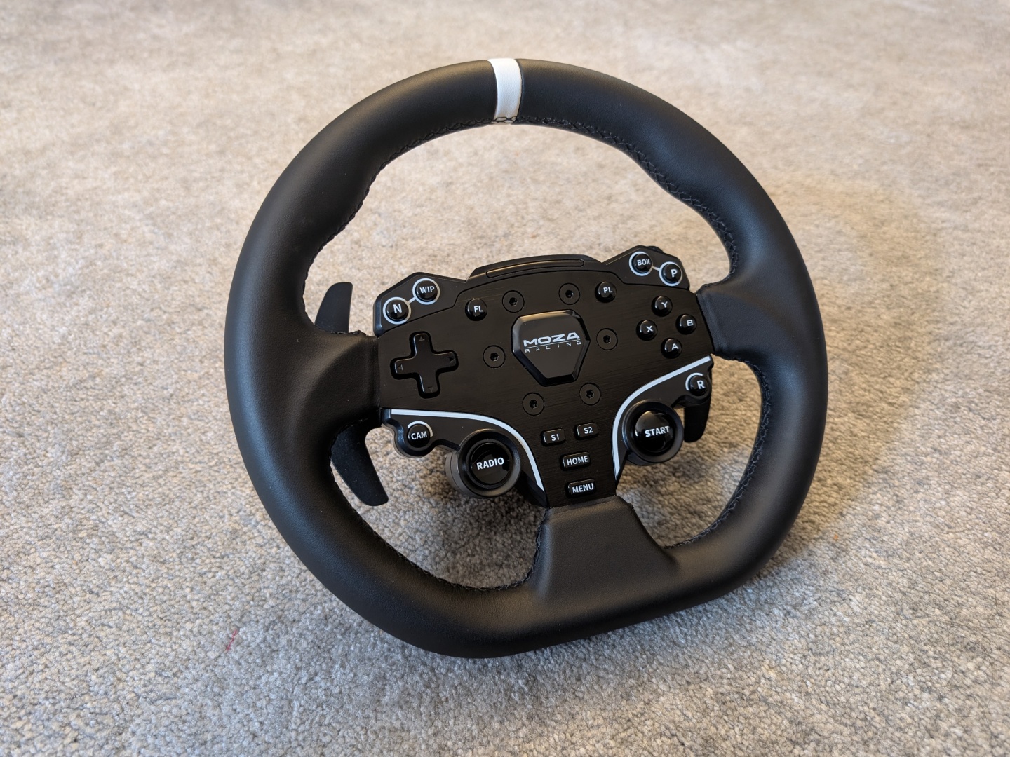 Per quanto riguarda il volante ES, si tratta di un volante da 11 pollici con struttura in lega di alluminio e pelle in microfibra. Ci sono 22 pulsanti sul quadrante e due paddle sul retro. Sfortunatamente, si tratta di paddle meccanici a molla e non magnetici, che è anche il punto in cui il pacchetto R5 mostra la sua età. Il volante è dotato di una serie di LED per il contagiri.